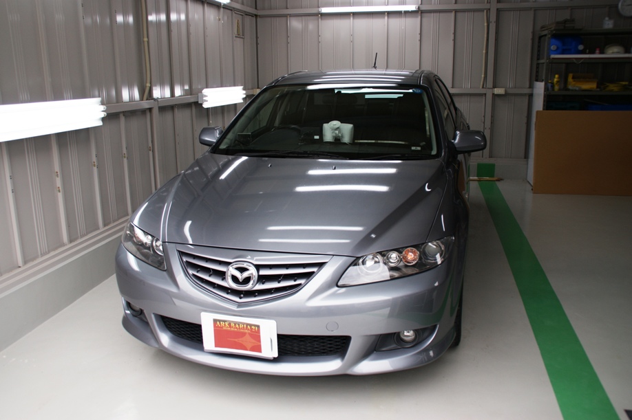 チタニウムグレーメタリックのアテンザにアークバリアを、アルミホイールにカナメを施工させていただきました。